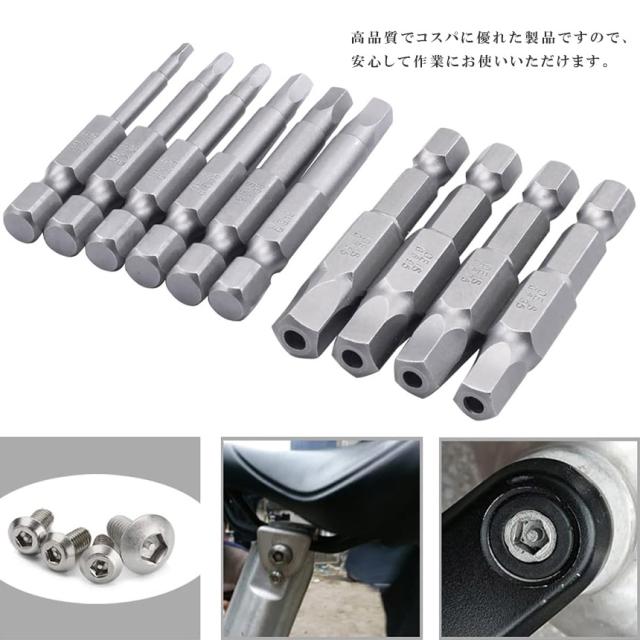 2.15、2.85、3.15、4.05、4.35、5.15、6.35、6.75、6.95、7.55mmの10サイズ。差込角対辺、6.35mm。電動ドライバー差し込み口は一般的な六角です。
