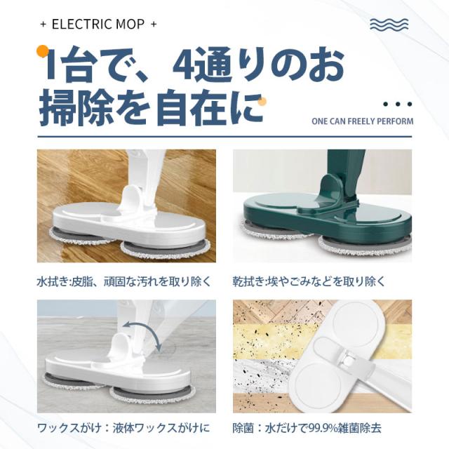 ●【1台4役お掃除】乾拭き/水や牛乳ジュースの除去などに、水拭き/ほこりや油などのお掃除に ・ワックスがけ/液体ワックスをモップ付け床のお手入れ・消毒/洗浄液などで雑菌や油汚れをお掃除