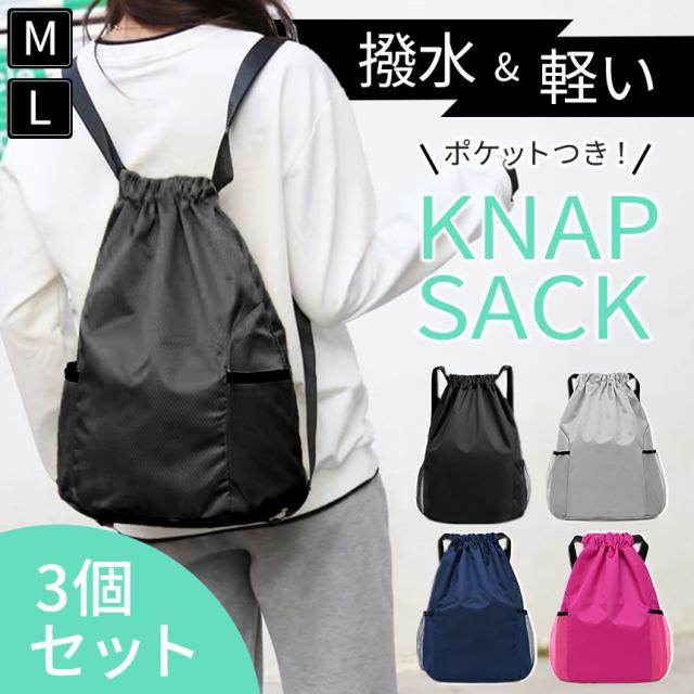 ナップサック 3個セット バッグ リュック 鞄 巾着 ナップザック リュックサック 撥水加工 軽い スポーツ 大人 子ども 大容量 ポケット 部活 プール 体操着 体操着入れ シューズ 靴 ケース おしゃれ かわいい M L 黒 ブラック グレー ネイビー ピンク かばん