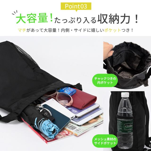 また内部にはチャック付きのポケット、サイドにはメッシュ状のポケットがあるのでバラバラとした小物や折り畳み傘なども分けて収納できます。