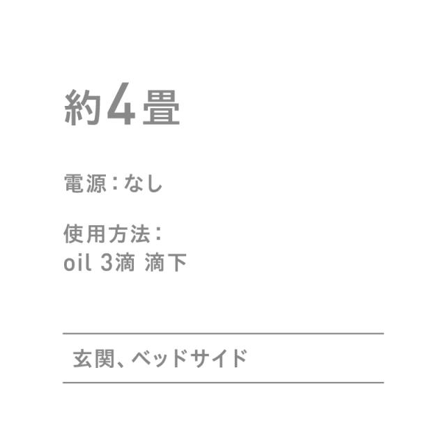 表面にエッセンシャルオイルを3滴ほど垂らすと、約4畳の空間に香りがやさしく広がります。