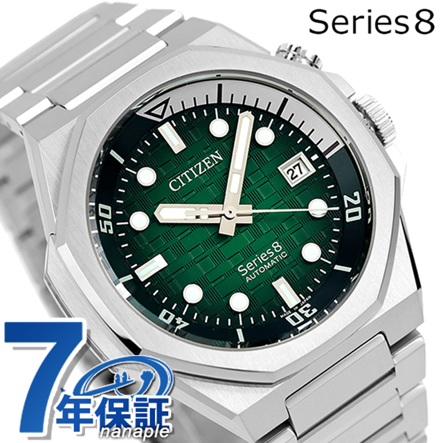 正規品 7年保証キャンペーン 送料無料 シチズン シリーズ8 890 メカニカル 耐磁2種 日本製 メンズ 腕時計 NB6060-58X CITIZEN Series 8 890 Mechanical アナログ グリーン ◆機能と実用性を兼ね備えたモダンデザインの機械式時計ブランド「Series 8(シリーズエイト)」。スタイリッシュなデザインで人気を集める「890 Mechanical」から、落ち着きのあるディープグリーンが印象的な新作が登場。アクティブなシーンで活躍するシリーズエイト唯一の20気圧防水仕様。グローバルな人気を誇る「890Mechanical」に、「緑豊かなマリンリゾート」をモチーフにした、落ち着きのある色味が魅力の新作が加わりました。オリジナルパターンを全面に描いた文字板には、海風に揺れる木々をイメージしたディープグリーンを配色。金属文字板の質感を生かした深みが、時計を見るたびに穏やかな気分をもたらします。 発売日:2025年3月発売 機械式腕時計