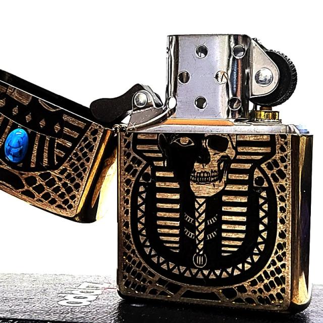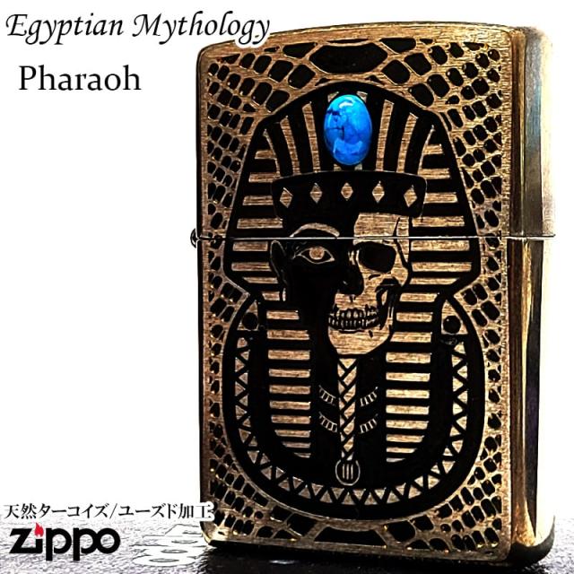 ZIPPO ライター ファラオ エジプト神話 ユーズド加工 ジッポ ターコイズ 天然石 アンティーク ブラス おしゃれ 両面加工 象形文字 かっこいい