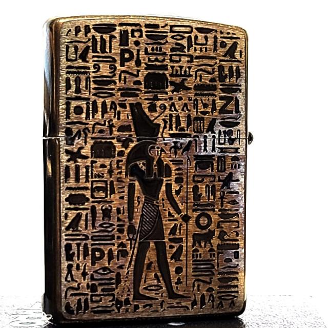 ZIPPO エジプト神話 ホルス アンティーク ブラス ジッポ ライター 両面加工 ユーズド加工 天然石 オニキス 象形文字 かっこいい 渋い 彫刻 ビンテージ
