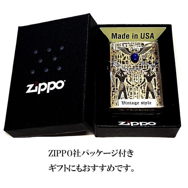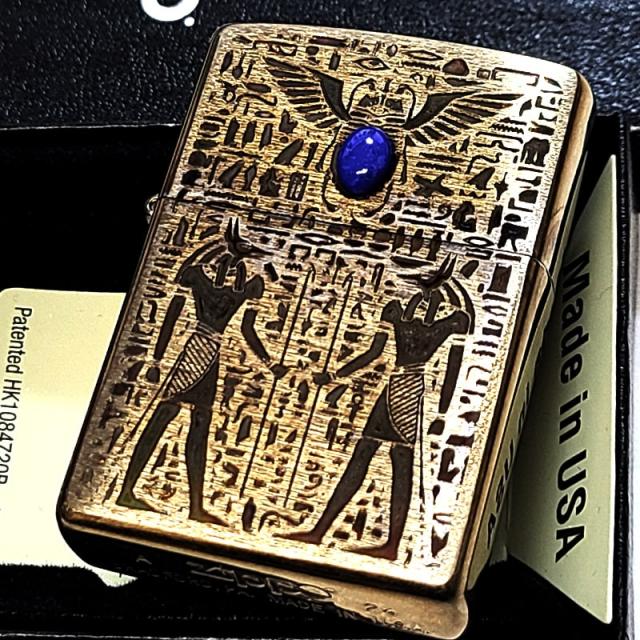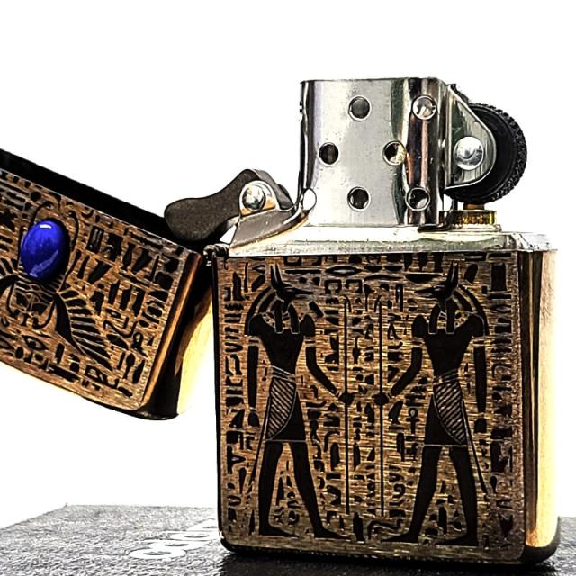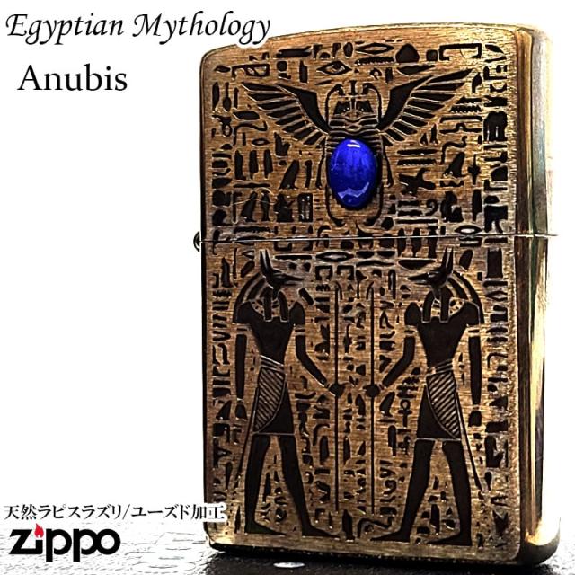 ZIPPO ライター エジプト神話 アヌビス ジッポ 天然石 ラピスラズリ ユーズド加工 アンティーク ブラス 両面加工 おしゃれ 象形文字 かっこいい 彫刻