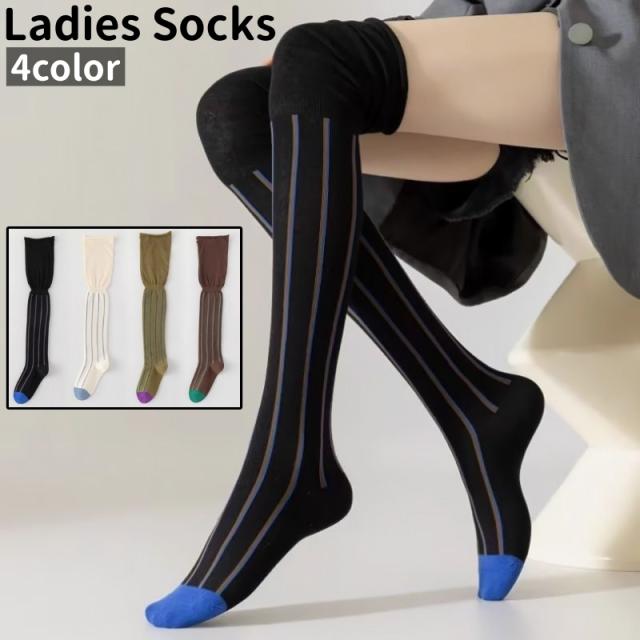 ニーハイソックス レディース 女性 婦人 靴下 くつ下 ソックス ニーハイ 黒 茶色 緑 ミルク色 ストライプ柄 おしゃれ シン