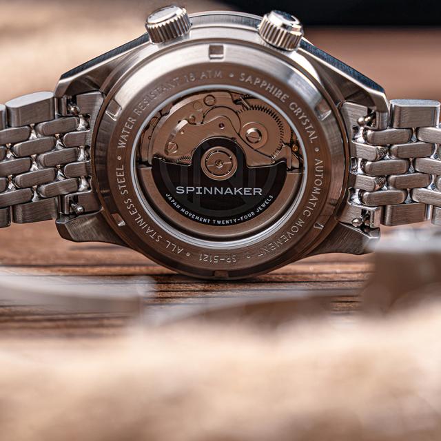 時計の心臓部には、日本製自動巻きGMTムーブメントのNH34を採用。優れた信頼性を誇り、正確な時を刻み続けます。ケースバックはシースルー仕様になっており、その複雑な内部構造を眺めることが可能です。