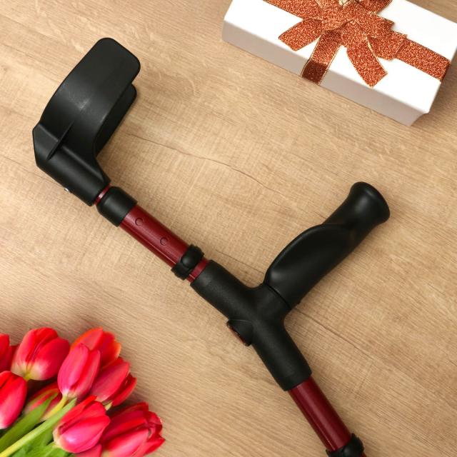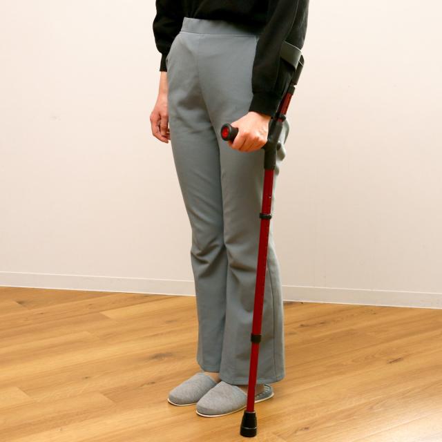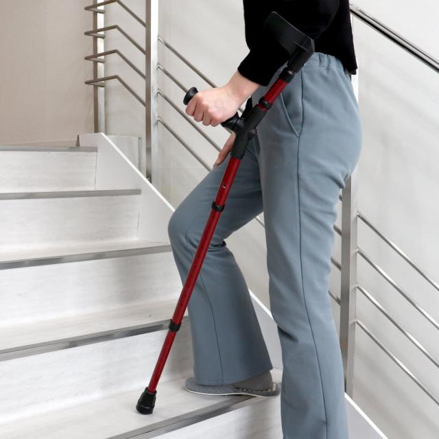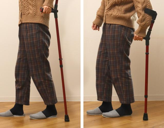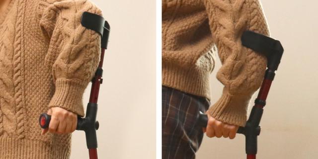 手首だけでなく、腕との2点で体重を分散して支えるため、T字杖よりも安定した歩行ができます。握力の弱い方、手首に力が入りにくい方に適しています。
