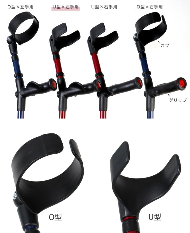 カフは腕をしっかりホールドする「O型」、着脱しやすいオープンタイプの「U型」の2種類です。グリップは「左手用」と「右手用」があり、ご自身に合った杖をセレクトできます。
