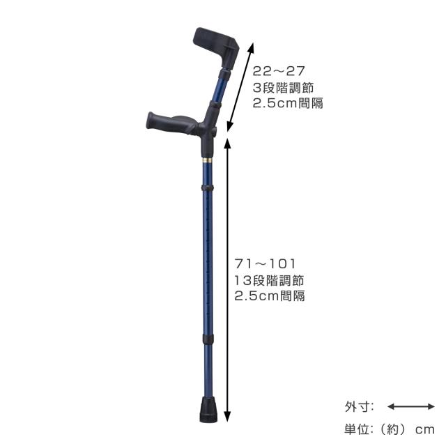 | サイズ | カフ〜グリップ:約22〜27cm 伸縮3段階(2.5cm間隔) グリップ〜杖先:約71〜101cm 伸縮13段階(2.5cm間隔) 杖先ゴム:オールニーズクラッチ用(19mm) |