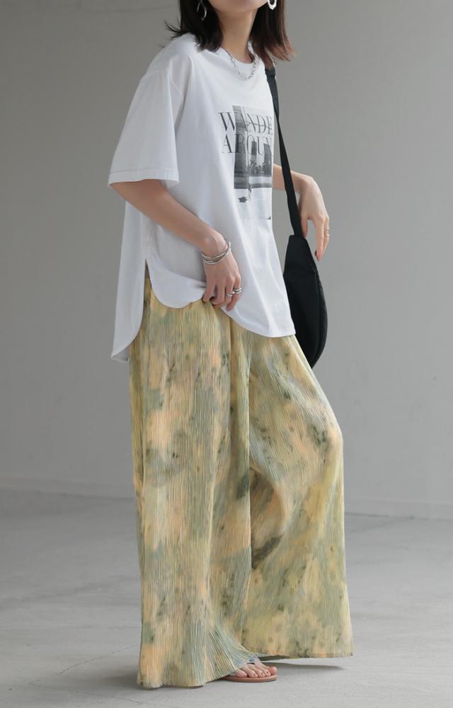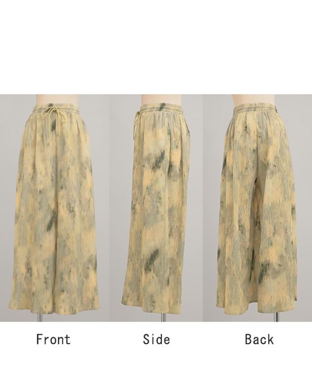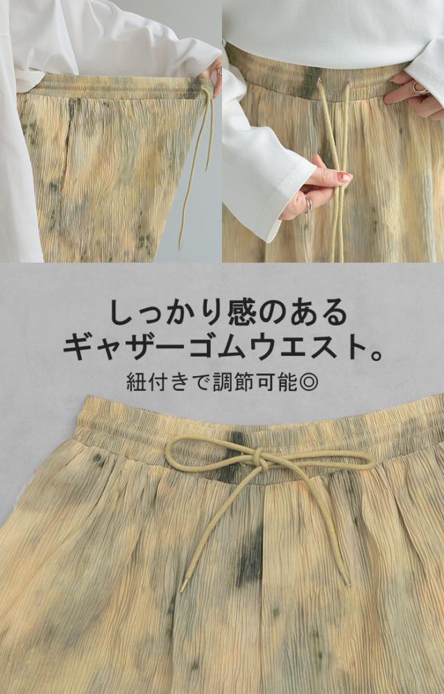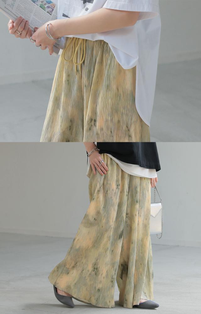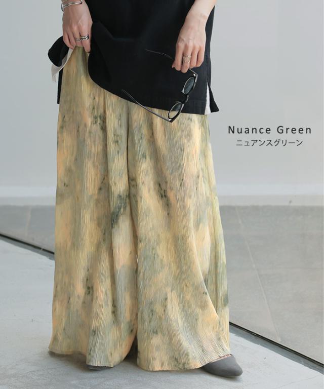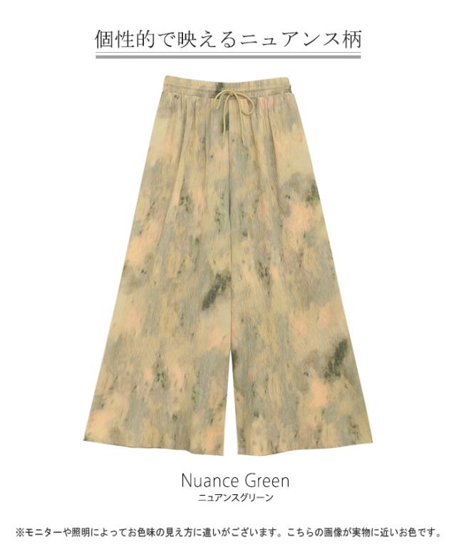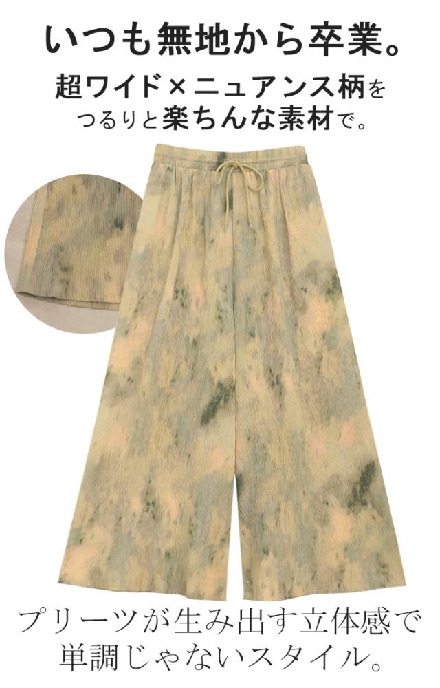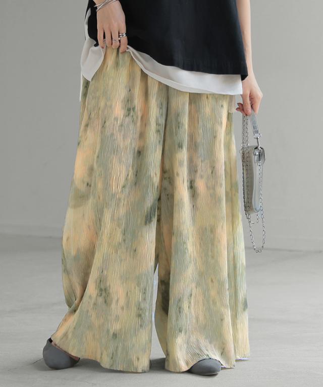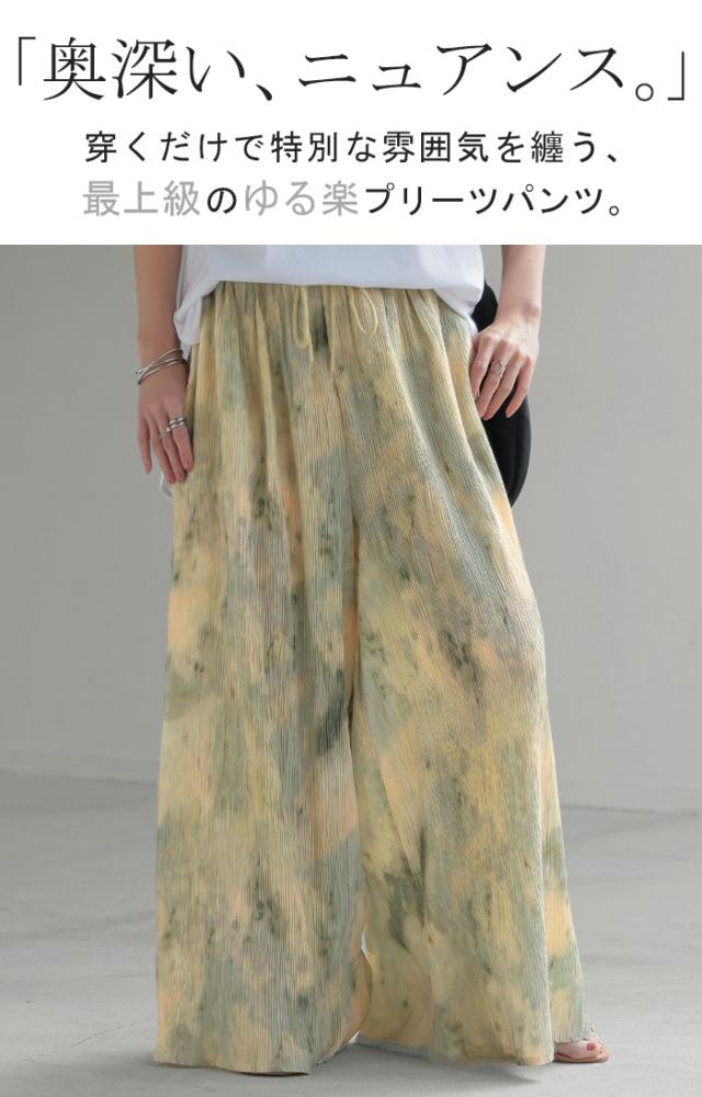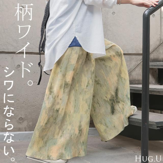 パンツ 柄 ワイド レディース 総柄 ペイント ワイドパンツ ロング ロングパンツ プリーツパンツ プリーツ 体型カバー ボトムス ボトム ストレート ズボン ゆったり ハイウエスト ゴム 大きいサイズ おしゃれ 水彩画 グリーン 黄色 春 冬 HUG.U 秋新作