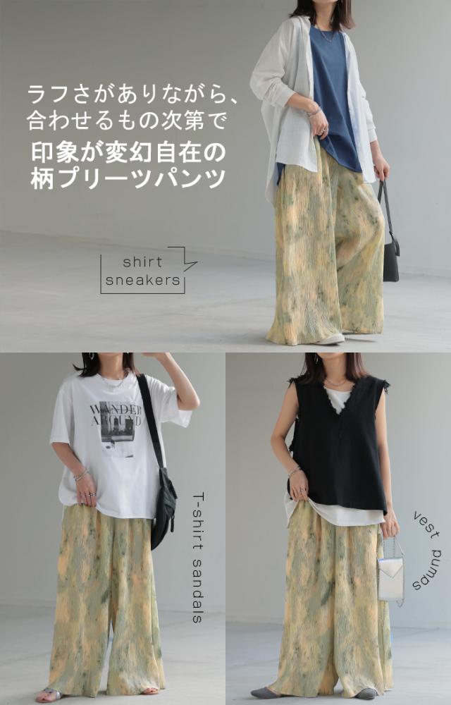 柔らかな穿き心地で楽ちんな総柄プリーツパンツです。