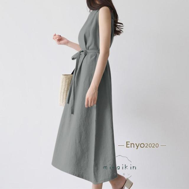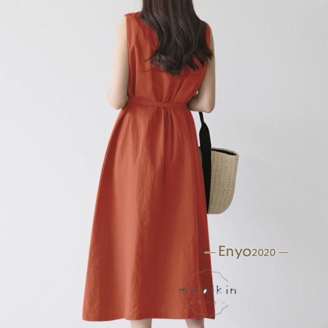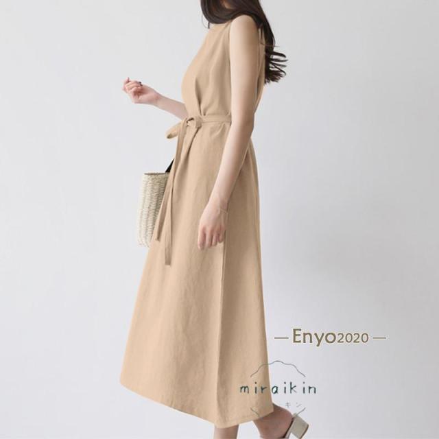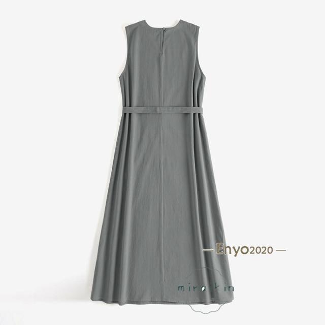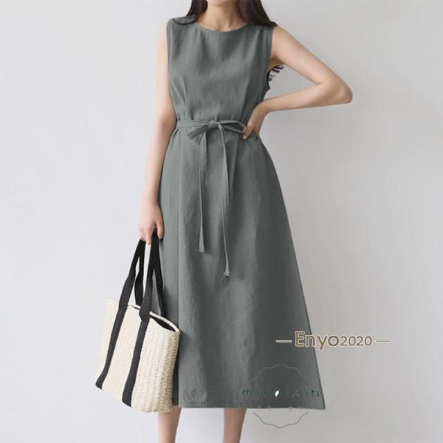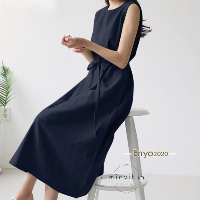 リネンワンピース ノースリーブ レディース 春夏 リボン付き 綿麻 夏秋 ロングワンピース マキシワンピース 丸首 無地 大きいサイズ展開 リゾート 40代50代