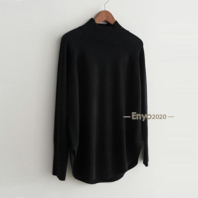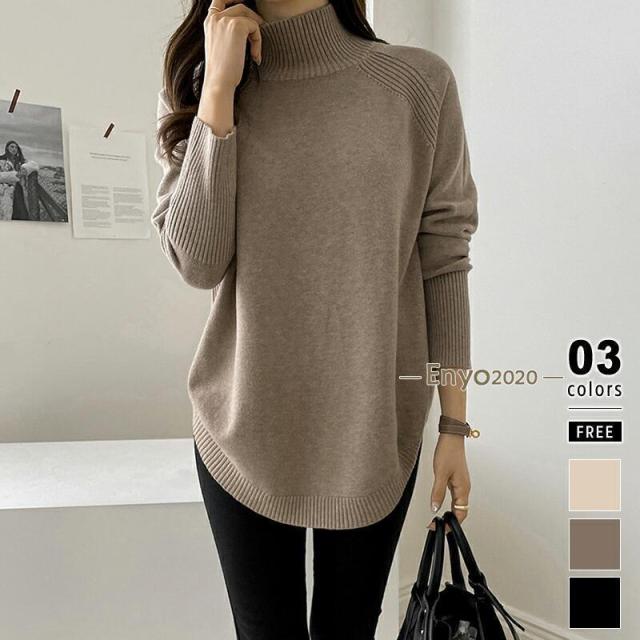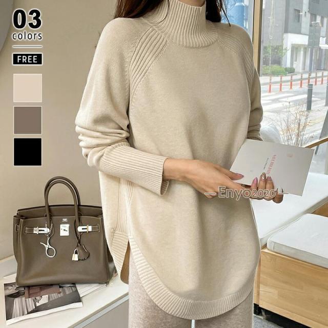 ニット セーター レディース ハイネック 長袖 トップス ラウンドヘム リブ ニットセーター ハイゲージ ゆったり 体型カバー シンプル 細見え やわらか チク