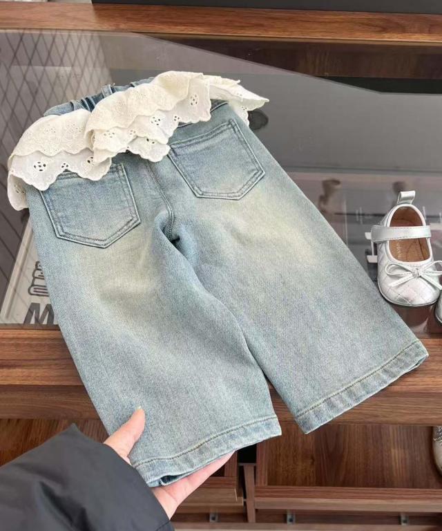 レースフリルがウエスト部分を彩る愛らしいデニムパンツ。フリルのデザインがキュートで、シンプルなコーディネートにもアクセントを加えます。裾にはリボンの刺繍が施されており、細かいディテールが魅力です。