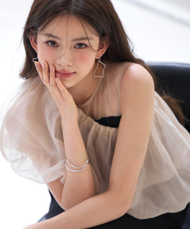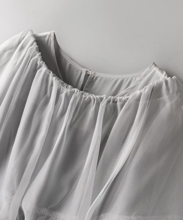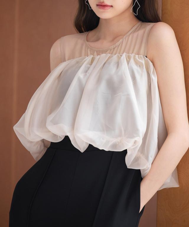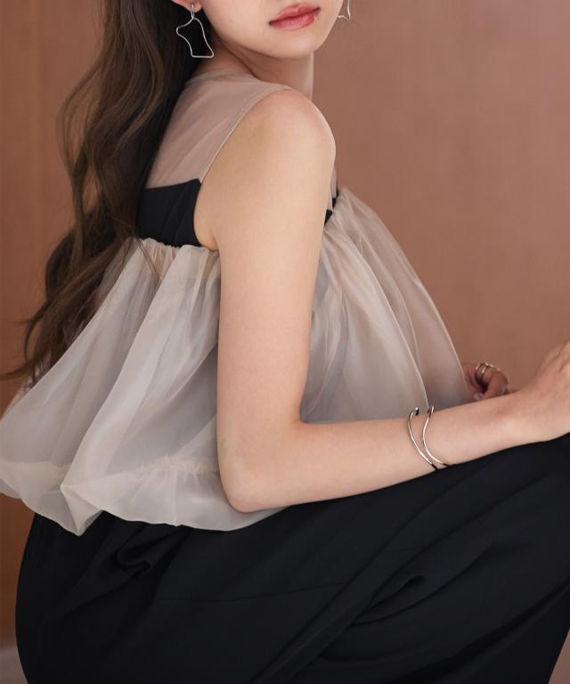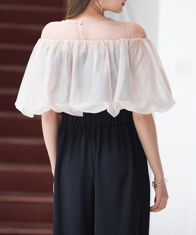 3wayのオフショルダートップスを変化させることで華やかなシーンにぴったり。オーガンジーならではのふんわり広がるデザインが華やかです。