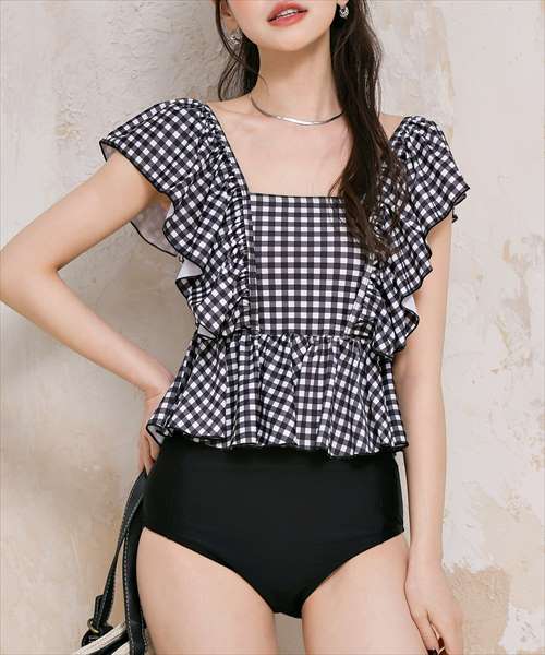 レディース水着 ギンガムチェックペプラムフリルハイウエストタンキニ 上下2点セット