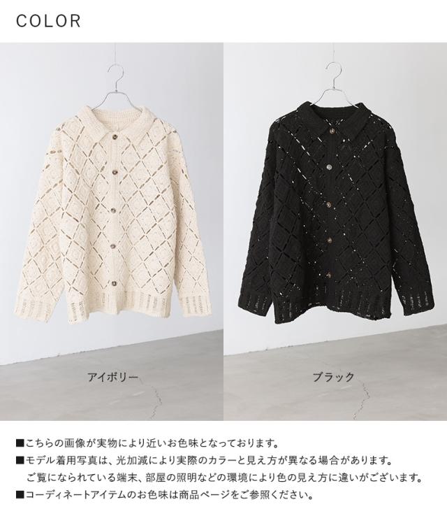 ■デザイン ダイヤ柄のクロシェ編みが目を引くニットカーディガン。襟付きで羽織りとしても使いやすく、季節の変わり目に重宝します。袖口と裾の太めのリブ編みとマーブル調のボタンがアクセントに。程よいニットの透け感で、インナーとのレイヤード感を楽しめる優秀アイテムです。 ■コーディネート インにはロンTを合わせてカジュアルに。ボトムスにはデニムパンツやスウェットなど、合わせるアイテム次第で様々なスタイリングを楽しめます。ボタンを閉じてトップスとしても着用できるので、着回し力も抜群です。 ■素材 立体的なクロシェ編みが特徴のざっくりとしたニット生地。ほどよい厚みがありながらも着やすい生地感です。 ■製品についての注意書き ローゲージニットにつきまして。 やわらかな糸を合わせて編むことにより、独特のざっくりした風合いを出しております。製品の特性上、ざらついたものに引っかかりやすく糸が飛び出すことがございます。 こちらの商品は、 モノフィラメント糸を使用しております為、お肌に刺激を感じる場合がございます。 ご了承の上、ご購入いただきますようお願いいたします。 |
