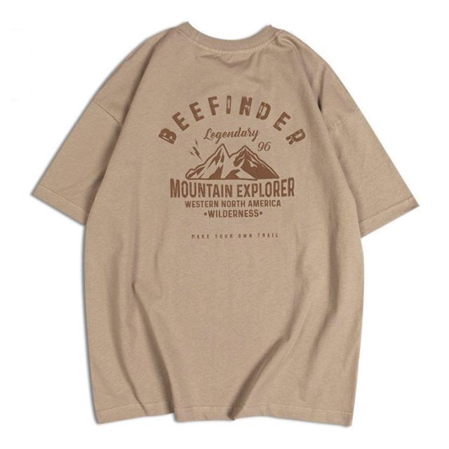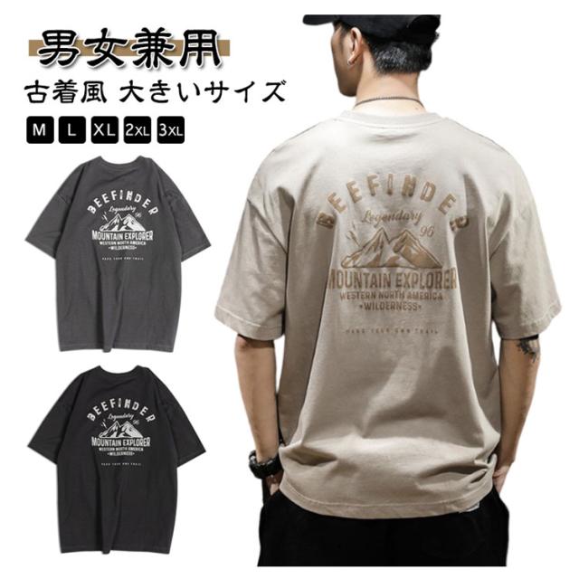 送料無料 tシャツ メンズ アメカジ 半袖 丸首 バックプリント 古着風 レトロ レディース カットソー トップス 山 英字 プリント ストリート カジュアル 大人 オーバーサイズ 大きいサイズ グレー 白 黒 かっこいい