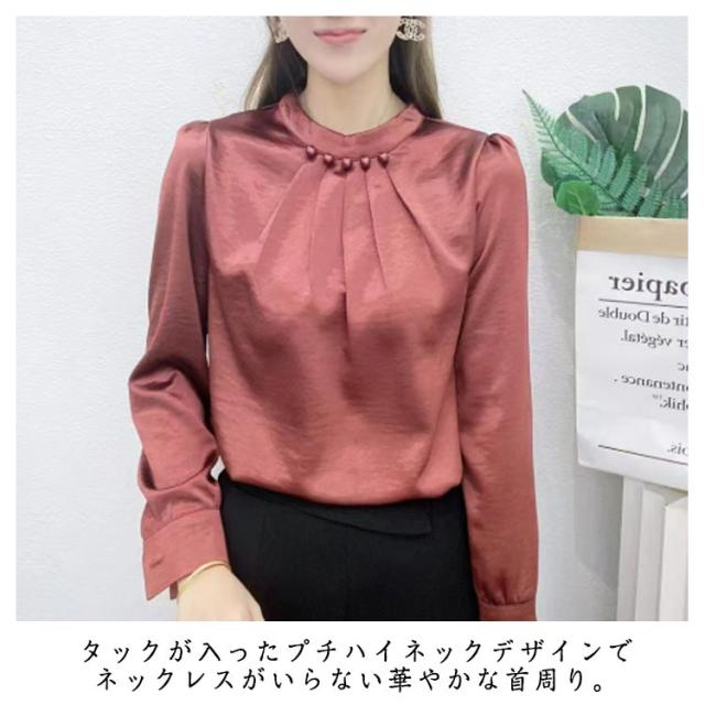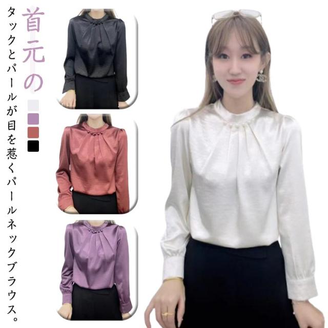 シャツ 長袖 ブラウス レディース パール付き ハイネック パール プチハイネックブラウス 長袖ブラウス フォーマル トップス フォーマルブラウス オフィスブラウス 長袖ブラウスレディース フォーマルブラウス