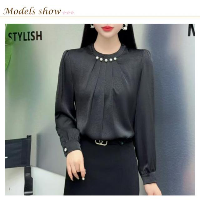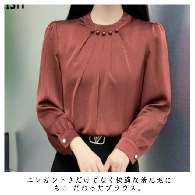 長袖 ブラウス ハイネック パール シャツ 長袖ブラウス レディース プチハイネックブラウス トップス パール付き フォーマル フォーマルブラウス オフィスブラウス 長袖ブラウスレディース フォーマルブラウス