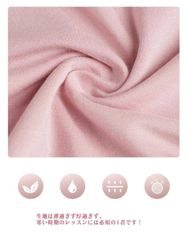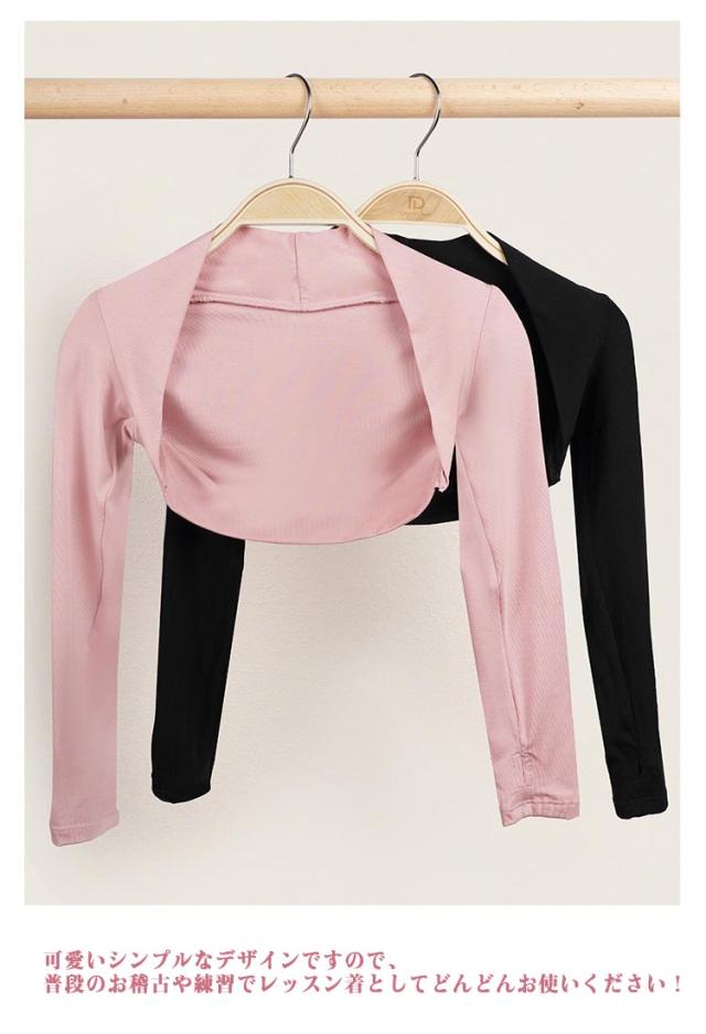 | 弾力性のある素材で柔らかく、より身体にフィットして動きやすいです。 生地は薄過ぎず厚過ぎず、寒い時期のレッスンには必須の1着です! ボレロタイプなので、気軽に着脱ができます。 激しく動いても、ほどける心配もありません! 可愛いシンプルなデザインですので、普段のお稽古や練習でレッスン着としてどんどんお使いください! | |