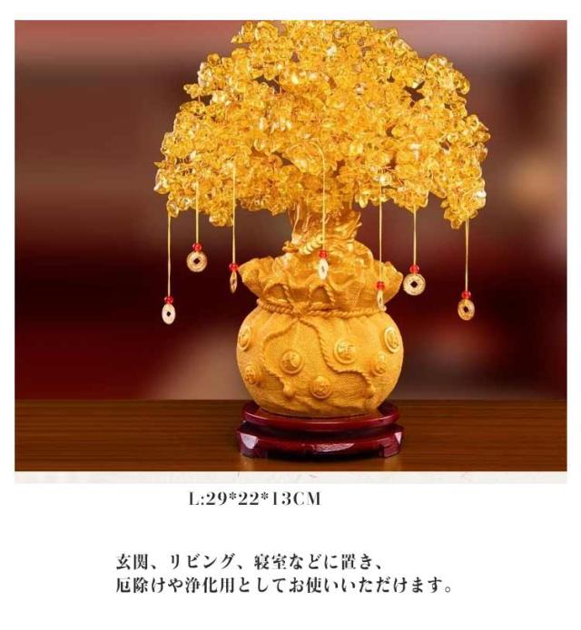 | 「金の生る木」、財運を呼び込む風水置物です。 大きいサイズ 招財樹の葉は黄水晶です。黄水晶は知恵と喜びのシンボルで、自信と希望を与えてくれるエネルギーがあると考えられています。黄水晶は富の石の美称で、商売繁盛,事業の発展を安定させ、金運をもたらすと言われています。招財樹はサービス系のビジネス会社や事業者に欠かせない財宝です。 新年祝い・新築祝い・開店祝い・開業祝いなどの贈り物にも活用されています。招財樹の枝は銅線ですので、お好みに合わせて自由に形をを変えられます。 招財樹は縁起のいい財運を招きます、商売をする家や店の入り口に置いてもいいです。会社の社長室、応接室、受付などにも最適です。玄関、リビング、寝室などに置き、厄除けや浄化用としてお使いいただけます。 | |