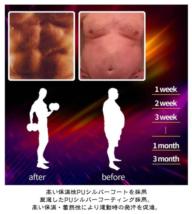 | 大量発汗 サウナTシャツ 脂肪燃焼効率UP! S-5XL 【おすすめポイント】 ・気になる箇所で集中発汗 気になるお腹や背中周りで ・発汗し、脂肪燃焼を促進 適度な加圧で瞬間スリム ・お腹周りに圧を加える特別設計 薄くても耐久性の高い素材 ハードなトレーニングにも耐えられる素材を採用 ●ポイント1 特殊生地による発汗力 速乾素材は汗を素早く吸収して体を乾燥させ、保温ポリマーは皮膚の水分を保持して乾燥を防きます。この組み合わせにより発汗効果が最大限に引き出されます。 ●ポイント2 発汗効果を高める3層構造 ・外側からの冷気を通さに くくし保温効果を高めます ・中間層 PUシルバーコート採用 優れた保温性と蓄熱性で新陳代謝アップ ・ナノコーティング層 熱を逃さない保温効果で発汗力UP ●ポイント3 動きやすいストレッチ素材 ストレッチ伸縮素材を採用しているため、動きやすく運動に最適! ウオーキング、ランニング、筋トレやヨガなどのエクササイズ時や普段の防寒着としてもお使い頂けます。 ●ポイント4 シャカシャカしない静音生地 柔らかでなめらかな素材なのでシャカシャカ音が発生しづらく周りを気にせずトレーニングできます。 ●ポイント5 高い保温性PUシルバーコートを採用 厳選したPUシルバーコーティング採用。高い保温・蓄熱性により運動時の発汗を促進。 優れた伸縮性と耐久性 ボリエステルとシルパーコーティングは耐水性強い同時に変形や引き製きがしにくい。 素材の性質上、手洗いでのお洗濯を推奨しておりますが、洗濯機でのお洗濯や脱水もOK! | |