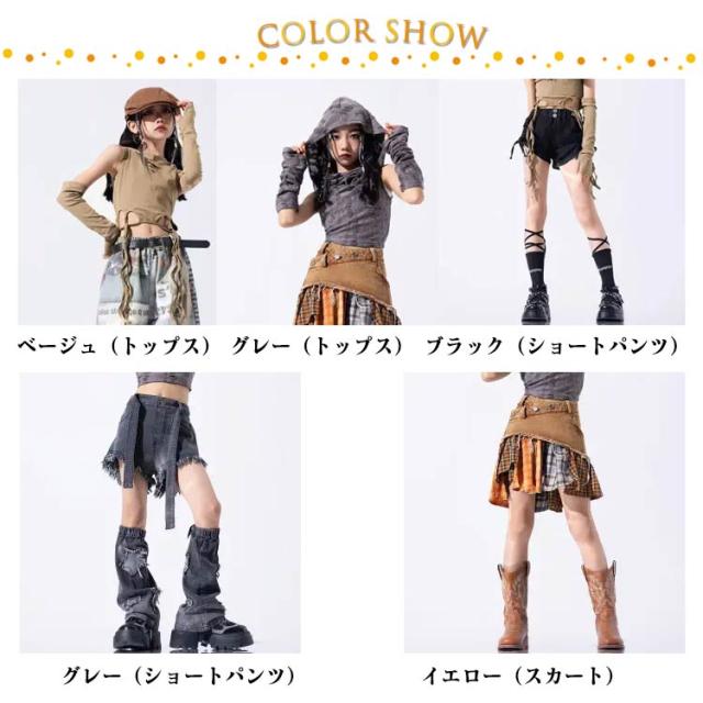 | 色 | ベージュ(トップス) グレー(トップス) ブラック(ショートパンツ) グレー(ショートパンツ) イエロー(スカート) |