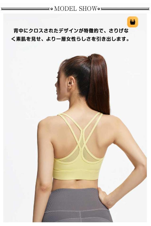 | 肌に優しいノンワイヤーブラです。 吸汗速乾素材を採用し、吸汗性、速乾性に優れ、さらりとした質感の気持ちいい履き心地、汗による肌のベタつきを軽減し、運動中の身体も快適でドライな状態に。 背中にクロスされたデザインが特徴的で、さりげなく素肌を見せ、より一層女性らしさを引き出します。 ホットヨガ、フィットネス、トレーニング、ランニング、ダンス、ピラティス、ウォーキングなどさまざまなシーンで着られるスポーツブラです! | |