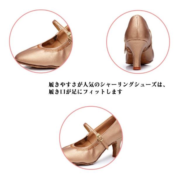 | モダンシューズ 本革 3ヒール選べる 3/5cm/7cm 22〜25.5cm 足に優しい軟らかいPUを使用した、上品なメタリックピンクゴールドの輝きのダンスシューズです 2層の牛革を使用したソールを採用しており、静音性と優れた滑り止め効果があります 履きやすさが人気のシャーリングシューズは、履き口が足にフィットします どんな形の足にも合いやすく、履けば履くほど足に馴染んでいきます | |