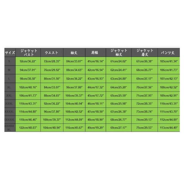 | サイズについての説明 | S ジャケットバスト(92cm) ウエスト(72cm) 袖丈(41cm) ジャケット着丈(67cm) パンツ丈(105cm) M ジャケットバスト(94cm) ウエスト(76cm) 袖丈(42cm) ジャケット着丈(68cm) パンツ丈(106cm) L ジャケットバスト(98cm) ウエスト(80cm) 袖丈(43cm) ジャケット着丈(69cm) パンツ丈(107cm) XL ジャケットバスト(102cm) ウエスト(84cm) 袖丈(44cm) ジャケット着丈(70cm) パンツ丈(108cm) 2XL ジャケットバスト(106cm) ウエスト(88cm) 袖丈(45cm) ジャケット着丈(71cm) パンツ丈(109cm) 3XL ジャケットバスト(110cm) ウエスト(92cm) 袖丈(46cm) ジャケット着丈(72cm) パンツ丈(110cm) 4XL ジャケットバスト(114cm) ウエスト(96cm) 袖丈(47cm) ジャケット着丈(73cm) パンツ丈(111cm) 5XL ジャケットバスト(118cm) ウエスト(100cm) 袖丈(48cm) ジャケット着丈(74cm) パンツ丈(112cm) 6XL ジャケットバスト(122cm) ウエスト(104cm) 袖丈(49cm) ジャケット着丈(75cm) パンツ丈(113cm) ※測定方法によって誤差が生じますので、予めご了承下さい。 |