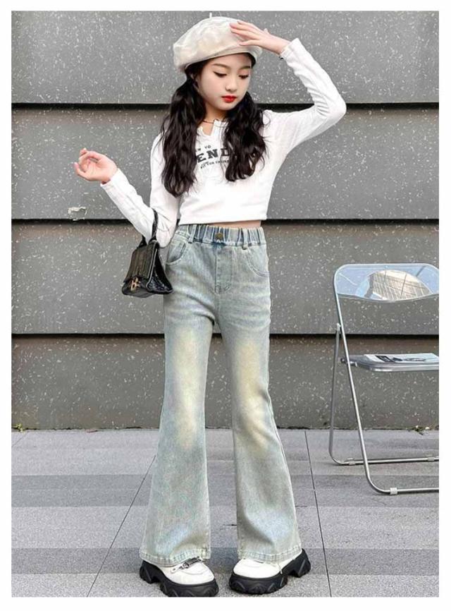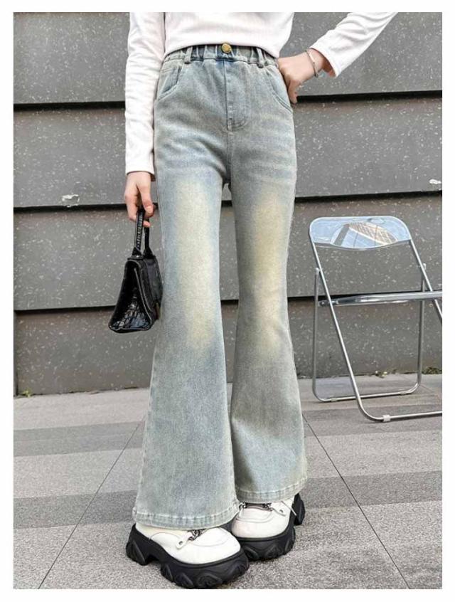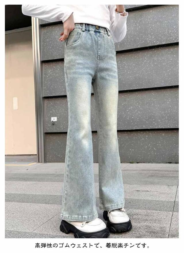 ジーンズ 女の子 デニムパンツ ジュニア ジーパン 小学生 キッズ 韓国 服 120 ロングパンツ ファッション 中学生 秋服 フレアパンツ 子供 ダンス 衣装 長ズボン ボトムス おしゃれ ブーツカット ウエストゴム 130 140 150 160