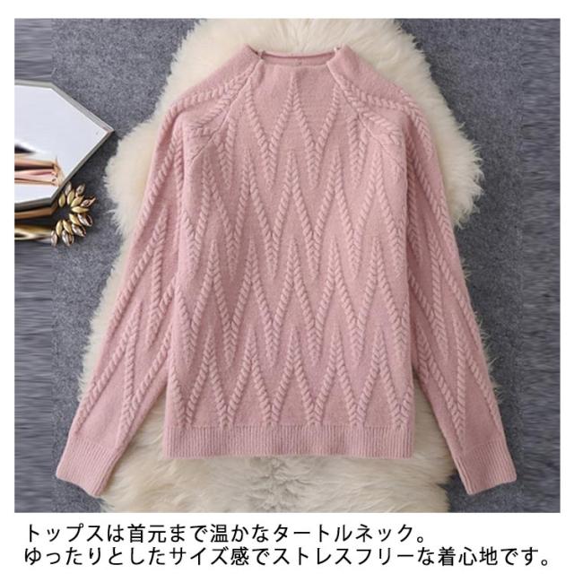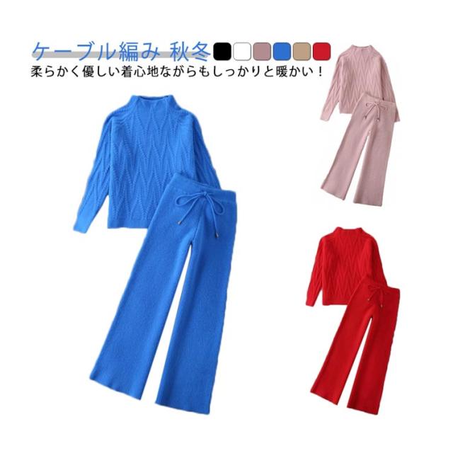 ケーブル編み 上下セット ゆったり レディース 秋冬 アイボリー ボトルネック セーター ワイドパンツ ウエストゴム ニットパンツ ニットアップ 厚手 ケーブル編み プルオーバー 着回し ニットセット ピンク ブラック ブラック ベージュ
