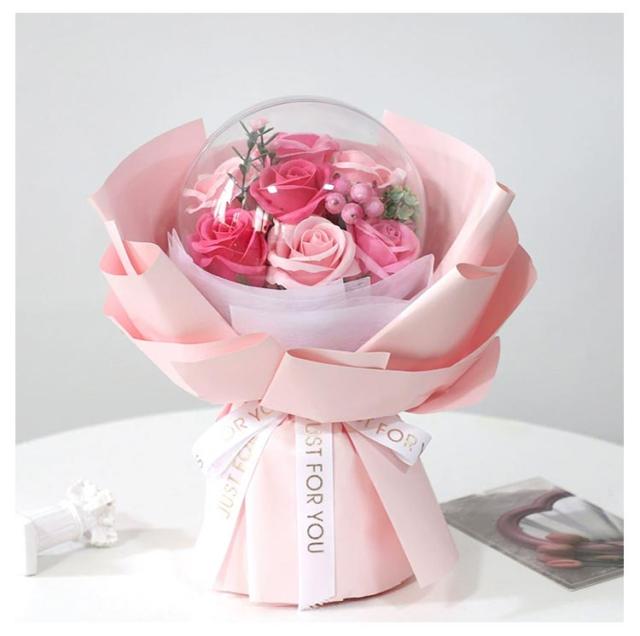 | そのまま立てて飾れるアクリルバルーンの花束 プラスチックで出来たケースなので しぼむ事もなく長期間綺麗に飾っていただけます。 バルーンの中にはソープフラワー。 ソープフラワーは花びらが石鹸でできています。 透明なバルーンケースの後ろに穴があるので ほんのりソープの香りも楽しめます♪ | |