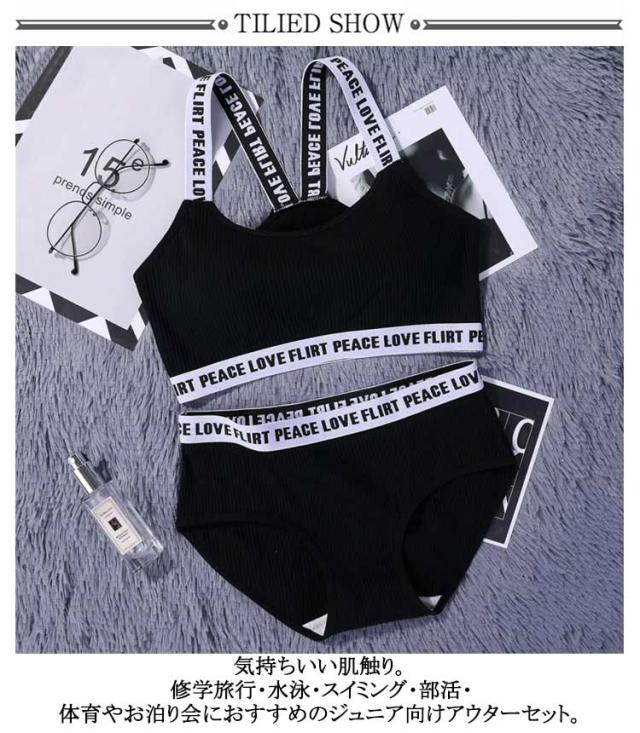 | 高学年〜中学生向け女の子用下着。 2組スポーツブラとパンツの上下セットアップです。 気持ちいい肌触り。 修学旅行・水泳・スイミング・部活・体育やお泊り会におすすめのジュニア向けアウターセット。 シンプルでおしゃれな人気の英字ロゴテープデザインがポイント。 伸縮性のあるノンストレスな着心地。 体にピッタリフィットして揺れないのでダンス衣装のインナーとしても大活躍! 見えてもかっこいい英字肩紐のスポブラなので、ブラジャーはまだ早いキッズのチューブトップやブラトップとしても安心して着用いただけます。 ファーストブラにおすすめ、新学期や新年に向けて新しい下着セットは色違いでも欲しくなっちゃう! | |