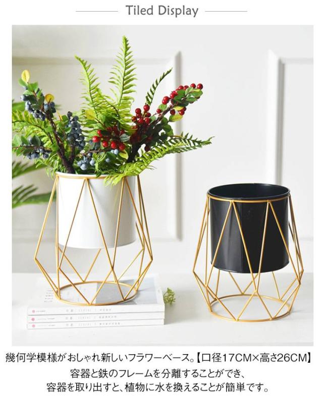 | 幾何学模様がおしゃれ新しいフラワーベース。【口径17cm×高さ26cm】 北欧風のシンプルデザインですので、部屋のどこに置いてもすんなりと馴染みます。 メッキ仕上げの鉄素材がおしゃれ。 容器と鉄のフレームを分離することができ、容器を取り出すと、植物に水を換えることが簡単です。 生け花やドライフラワーなどを飾ればお部屋が華やかになります。 | |