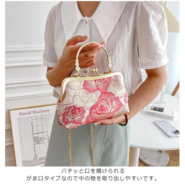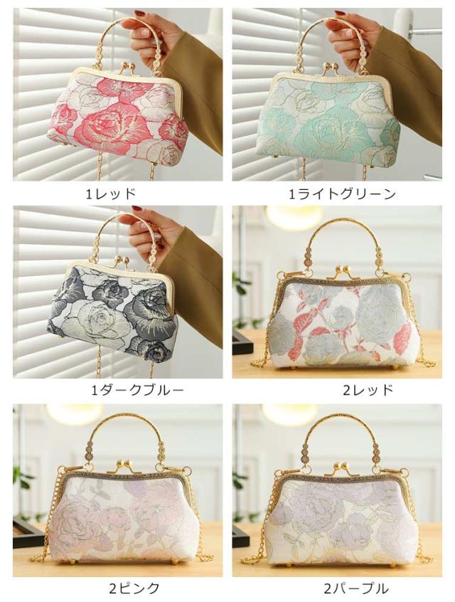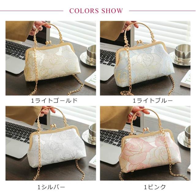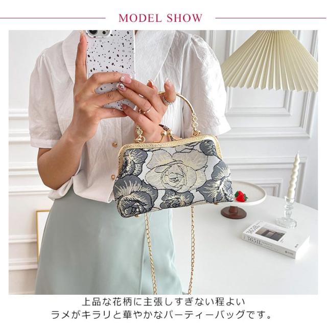 | 上品な花柄に主張しすぎない程よいラメがキラリと華やかなパーティーバッグです。 ハンドバッグとしてはもちろん、ショルダーチェーンが付属しているので斜め掛けにも使える便利な2way。 パチッと口を開けられるがま口タイプなので中の物を取り出しやすいです。 スマホ・ハンカチ・小さめのコスメなど必要最低限の小物を収納可能。 またマチがしっかりとあるので型崩れしにくいです。 和装・洋装どちらにも合うデザイン!煌びやかなゴールドの口金がフォーマルな雰囲気に馴染みます。 お手持ちのドレスや着物に合わせて選べる色からお好きなお色をお選びいただけます。 結婚式や二次会などでパーティバッグとして使うのはもちろん、大人女子スタイルのワンピースなどにも合うので日常使いにもオススメ!また成人式の振袖・卒業式の袴などのセレモニーシーンにもピッタリです。 | |