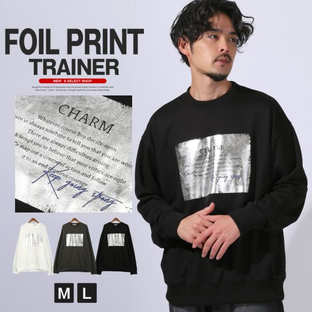 トレーナー スウェット プルオーバー メンズ オーバーサイズ ゆったり 裏毛 クルーネック ロゴ【シルバー箔プリントトレーナー】 aa-3458