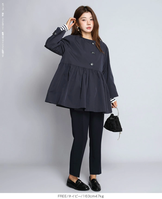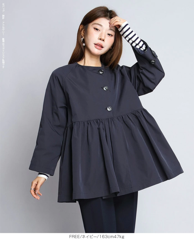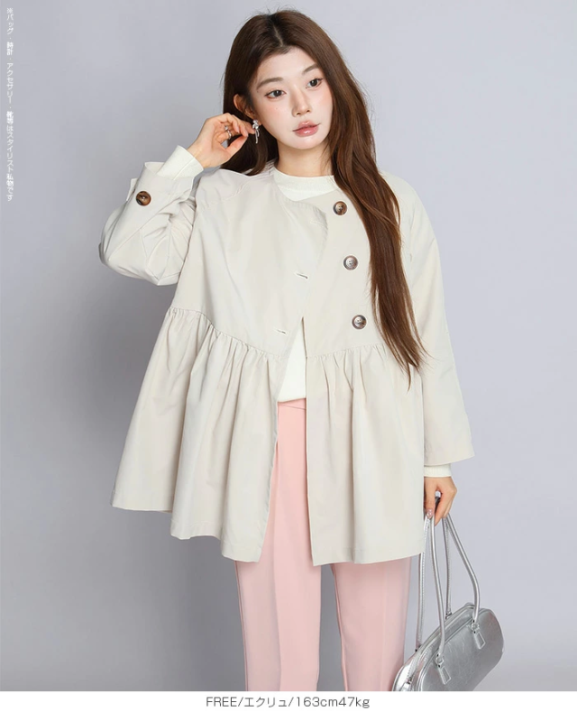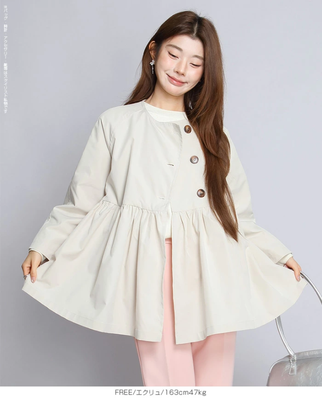 【ペプラムデザインスプリングコート】 程よいボリューム感で、 女性らしいペプラムデザインが立体的なフォルムを作るスプリングアウター。 フロントホックを留めることで、 コートを着たまま式典に参加できるくらいのきちんと感を演出。 ウエスト部分にたっぷりとあしらったギャザーがフェミニンな印象で、 外に出ても華やかに演出。 またデニムとの相性も抜群なのでカジュアルなスタイルもお楽しみいただけます。 |
