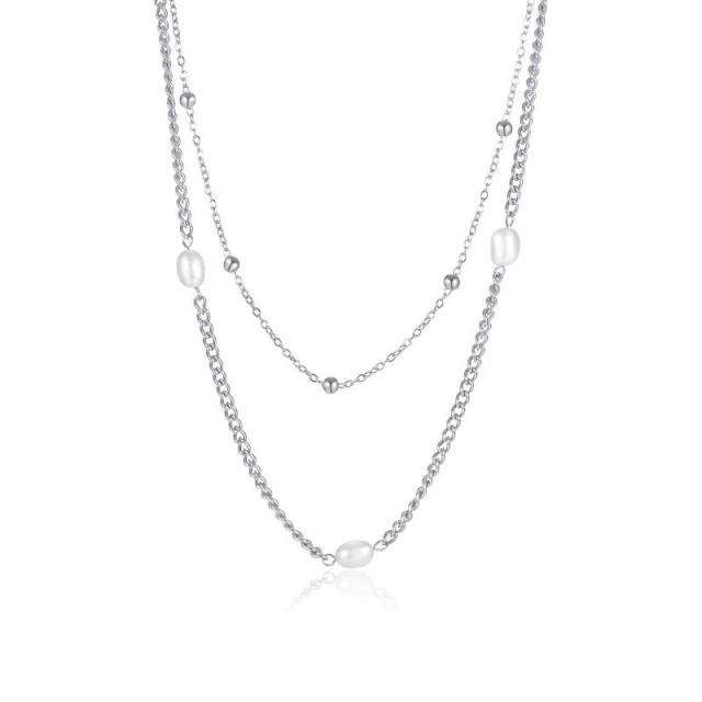 【Deelfel二連ネックレス】二連ネックレス レディース 金属アレルギー対応 あずきチェーン 真珠 女性ジュエリー【素材】チタン パール【サイズ】チェーンサイズ:370+55mm【重量】10g