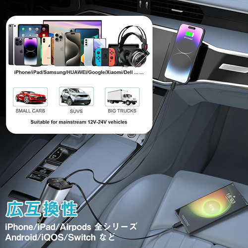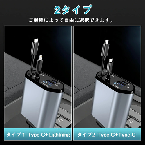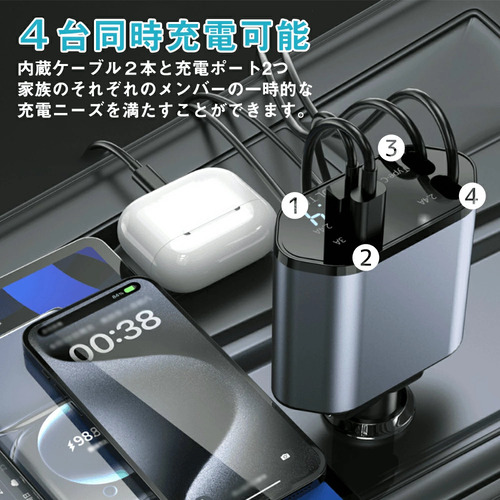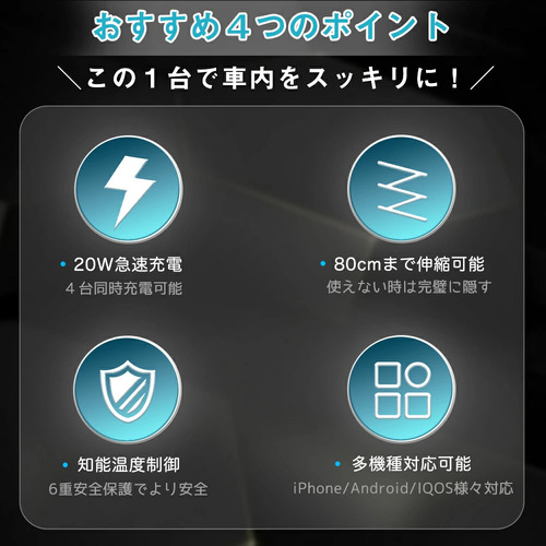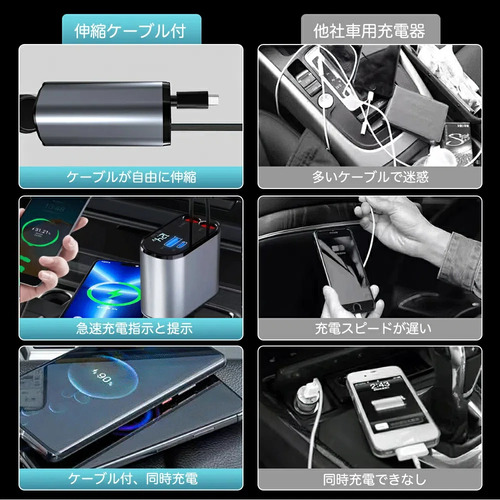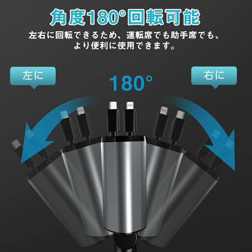 2 USBポート+2 巻取り式ケーブル、4台のデバイスを同時に充電でき。