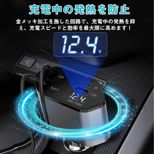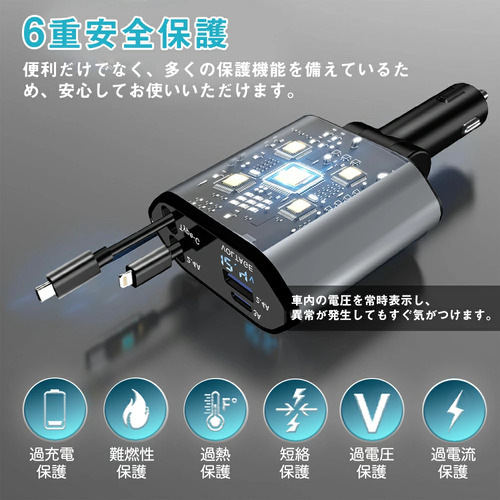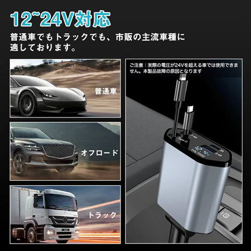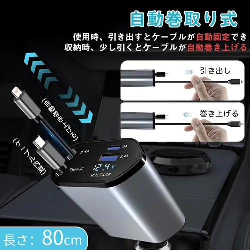 シガーソケット 延長 充電器 巻き取り リール式 USB Type-C Lightning PD急速充電 iPhone Android 車用充電器 4ポート カーチャージャー 4台同時充電 12V車 24V車 シガーチャージャー iPhone Android各種対応 巻き取り 車 USB 4ポート スマート充電 リールタイプ