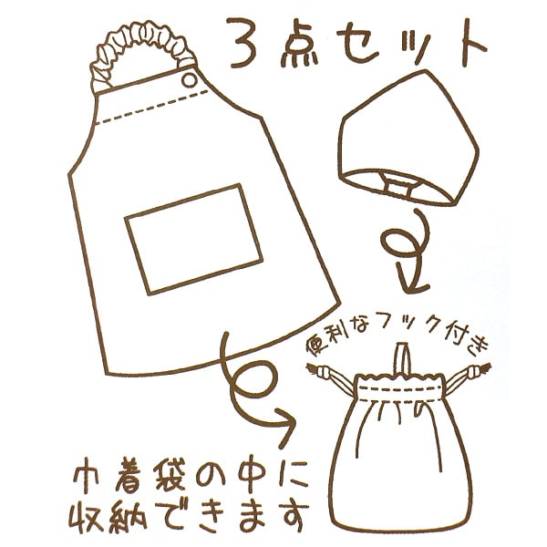 | 商品説明 | ※保育園・幼稚園・学校での給食当番や調理実習にはもちろん、おうちでの料理のお手伝いやイベントなどにも大活躍の、エプロン・ゴム付き三角巾・巾着袋の3点セット♪ ※3点とも同じ生地を使い統一感も◎!少しツルっとした生地です。長く使えるシンプルで飽きのこないデザイン! ※ママのお料理をマネっこしたがる小さな年頃のお子様にも、学校行事でエプロンが必要になる小学生にも対応! ※エプロンの首元と腰部分の紐は動きやすいギャザーゴム仕様!首紐はスナップボタンで2段階に調節可能!腰紐も大きめサイズのボタンで2段階調節が可能です!ポケットは前中央に付いています。 ※三角巾は後ろがギャザーゴムになっているので、帽子のようにスポッと被るだけでOK! ※持ち運びに便利な巾着袋はサイドの紐をキュッと絞るだけ!お子様でも簡単に開閉が可能。机の横のフックやランドセルに付けれるようにループ付き。 ※3点とも内側にはお名前を記入できるタグ付き。 |