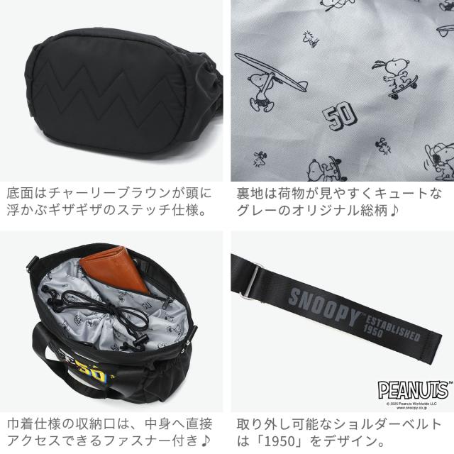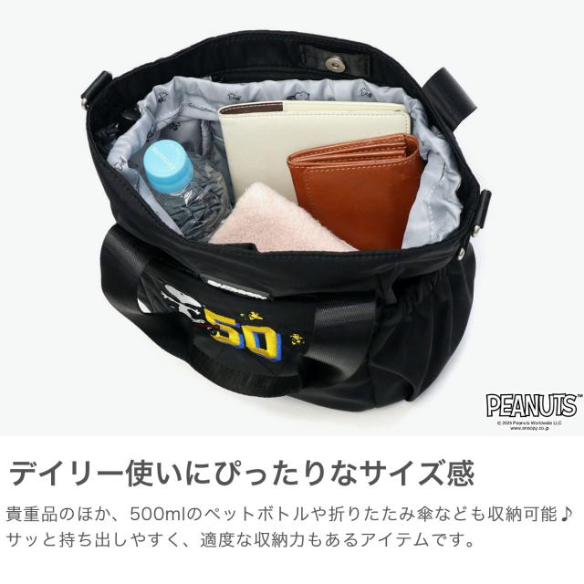 PEANUTSコレクションのスヌーピー刺繍がかわいい、2WAYトートバッグM。A5サイズ対応&8.6Lのコンパクト設計で、ちょっとしたお出かけにぴったり。軽量設計で肩掛け・斜めがけも快適。巾着仕様で中身が見えにくく安心。ユニセックスなデザインで、普段使いからレジャーまで幅広く活躍します。