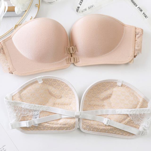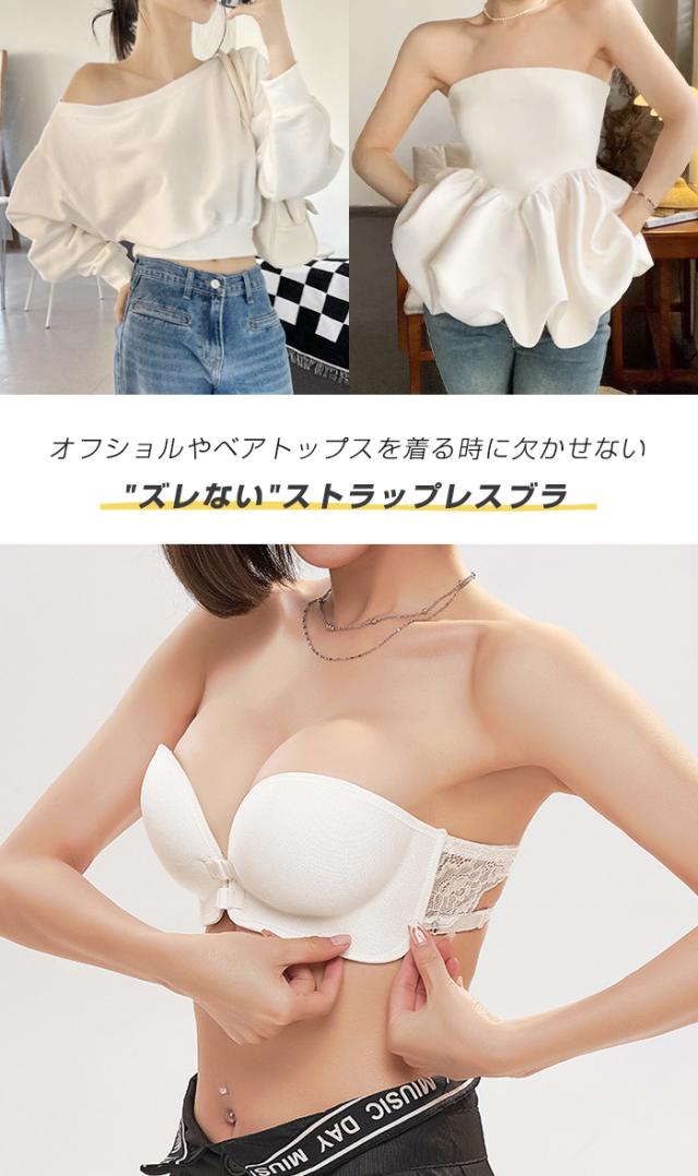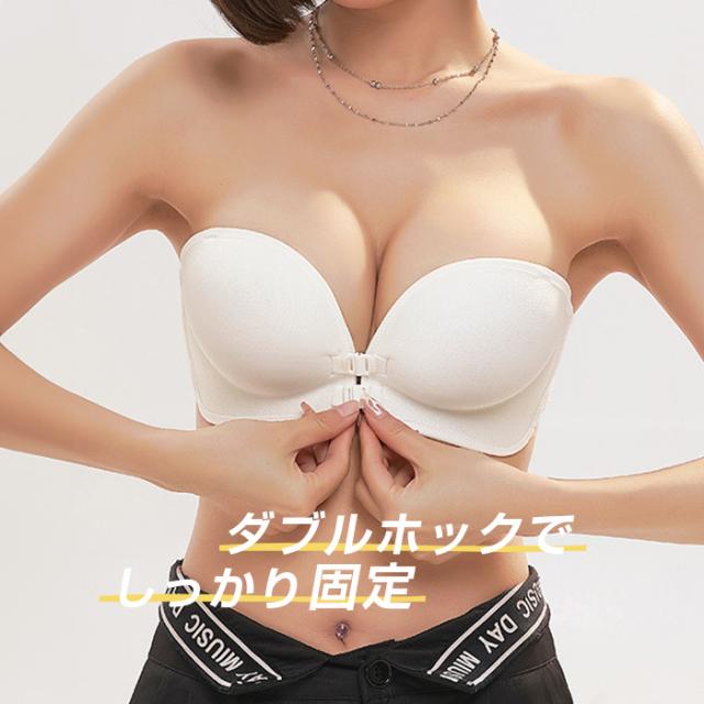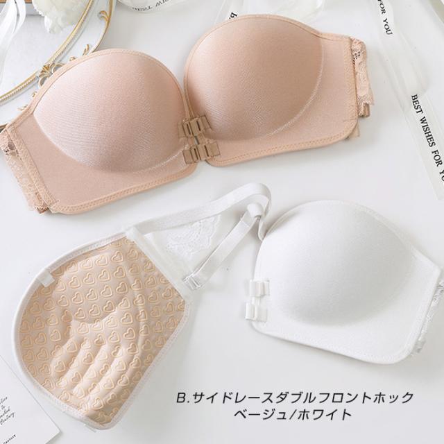 【 ズレ落ちないストラップレスブラ 】 オフショルダーやキャミソール・アメスリタンクなど、 ブラ紐を隠したいトップスを着用する際に便利なストラップレスブラ。 フロントホックだから、バックストラップでしっかりホールド。 きれいな谷間をメイクできて、カップの内側のシリコンでずれにくく、 まあるいバストをキープします。 シンプルなシングルフロントホック サイドレースが華やかでアンダーバストをしっかり支えるダブルフロントホック 脇肉も優しく寄せてくれるシングルフロントホック・サイドレースの 3種類からお選び頂けます。 |