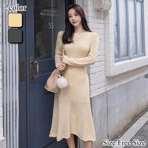 ざっくり編みで仕上げ、ふんわりしたミディアム丈のAラインワンピースは、ウエストの編みの切り替えがバストからウエストにかけてのラインをきれいに魅せることで体型をカバー。