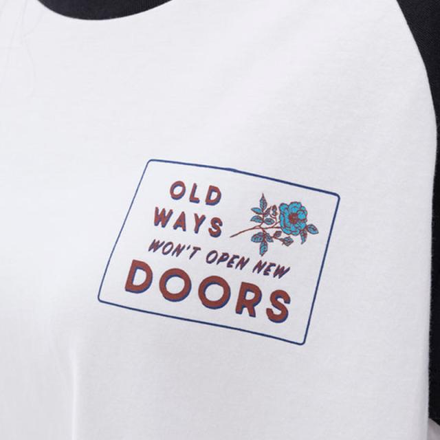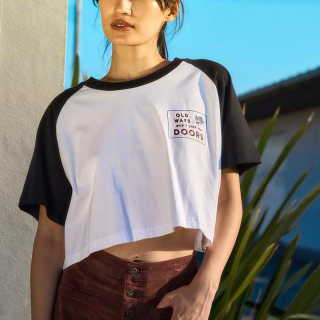 OLD WAYS CROPPED SS TEE ボディとショルダーを切り替えたラグラン仕様のクロップド丈のTシャツ。腰の位置を高く見せるため、脚が長く見える効果があり、ハイウエストのボトムスと組み合わせると、バランスの良いスタイルに。