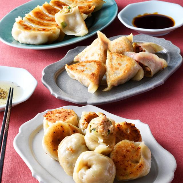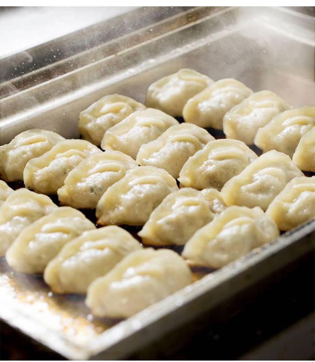 石川県小松発の餃子はちょっと個性的。コロッとして皮はモチモチ。地元の卸肉業者と作り上げた『アブラミンチ』を使うパンチのある「プレーン」、帽子型の「生姜」には粗く刻んだ生姜、三角の「梅」の餡には練り梅を混ぜてさっぱりと。3種3様の味と形が楽しい。