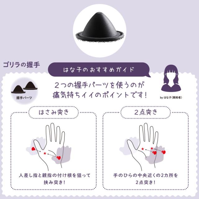 ピンポイントでぐーっと押し込む「握手パーツ」が2個付属します。2カ所を同時に突く『2点突き』や、ポイントを上下ではさむ『はさみ突き』がお好みで選べ、最高の痛きもちイイを実現しました。このサイズでも本格的なケアが可能で、左手右手兼用なので両手の疲れを解消します。